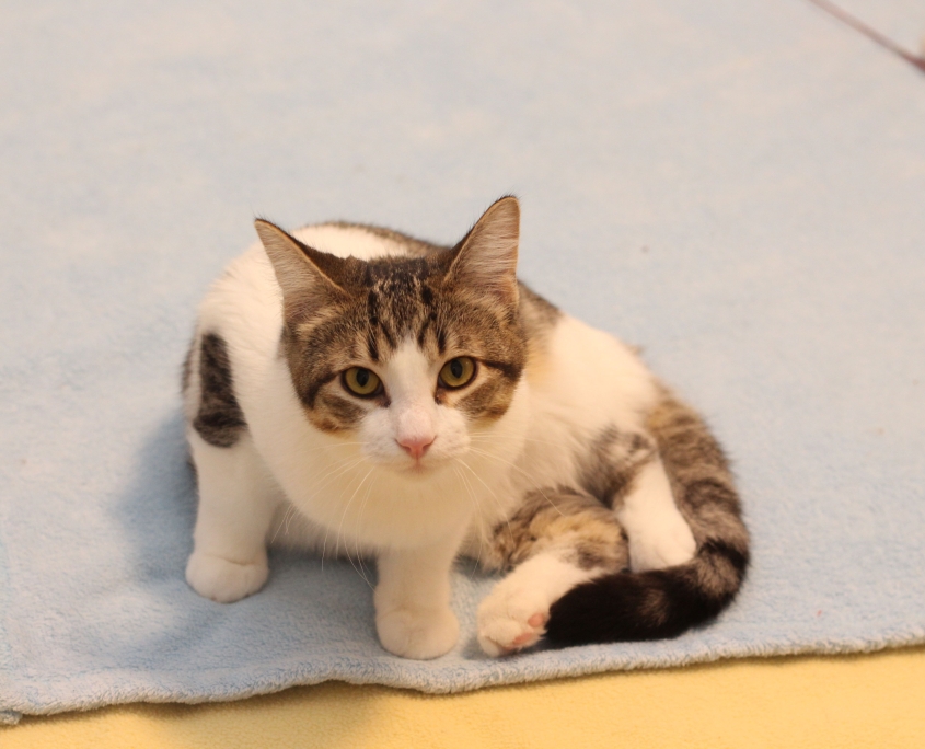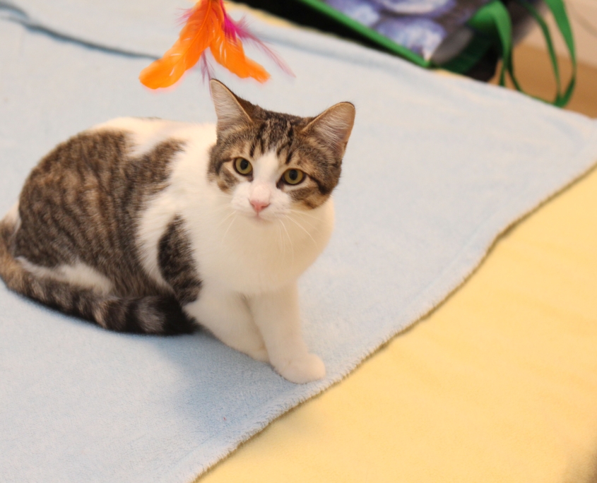 Who would abandon this young fellow? Born in June 2025, this little guy is friendly, gentle and cuddly. Even at the veterinary clinic for his initial health check and vaccines, he was at ease and co-operative. He was happy to be held and petted by the clinic staff and purred with the attention. But he also wanted to explore; he’s not unnerved by new situations, it seems. He is in very good shape, has been snap-tested for FIV and FeLV (both negative), vaccinated and de-wormed. From his foster mom, “Felix is one of the most loving kittens I have ever fostered. He has to know where his person is at all times! He plays, then will find you, curl up on you or beside you or sit on your lap when you’re at the computer.” When one of his foster-guardians enters the room, Felix runs to him and wants to be picked up. Once in his person’s arms, Felix hugs him.
