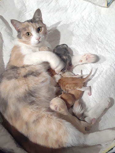 And Rhapsody was pregnant. It was thought when she first arrived in her foster-home that she might be expecting. Her sides and belly were not wide but neither were they the lean shape a young and vigorous cat should have. At her health-check, the veterinarian confirmed that Rho had four, probably five, little ones inside her. Sure enough, five babies came into the world the night of April 9th/10th. Yes, two of them will have different birthdates than their siblings. She is an excellent mother; she was attentive to the kittens’ needs right from the start, and likes to keep them close to her. The number in her litter, and the care she gives them suggest that she is an experienced parent: this was likely not her first pregnancy. Rhapsody and her kittens will be available for adoption starting July, 2026. (We always recommend adopting kittens in pairs, or to a home where there is a playful cat who would like a friend.) The interval will allow us to get to know Rhapsody better, and to see the personalities of her offspring, so keep watching here for updates to her profile. The kittens will have their own profiles soon.