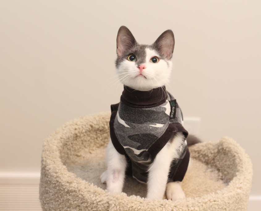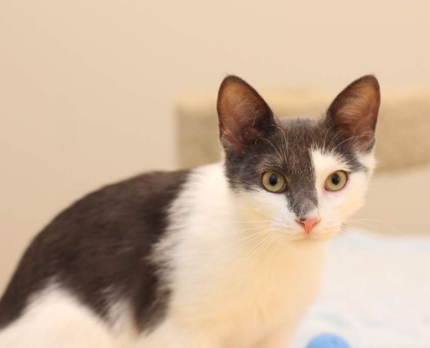 Talya doesn’t have much history, unfortunately: she had been abandoned. She was isolated from other cats for a couple of weeks until she was health-checked, snap tested (all negative) and vaccinated.During that time she was treated for an eye infection which she had upon intake. It likely started as something viral. After two rounds of antibiotics with not much improvement, our veterinarian switched the drops to a newer treatment called Cidofovir Ophthalmic which “is a topical antiviral medication used to treat viral infections of the eye”. The treatment worked extremely well and Talya’s eye is all healed up. She breezed through her spay surgery.