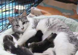Tilly was a stray being fed by a benevolent householder. She clearly had had a home at one time, as she was very friendly and trusting of humans. But she had not been spayed and was now pregnant. When her benefactor realized that she was very close to giving birth, he felt that he had to bring her in from the cold and dangerous outside, despite having several cats of his own already. Tilly gave birth the day after she was given refuge, but, due to the number of cats already present in the small home, Tilly and her new family were found space in a PAW foster-home.