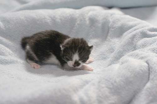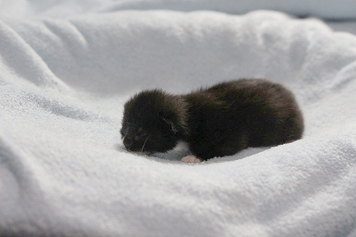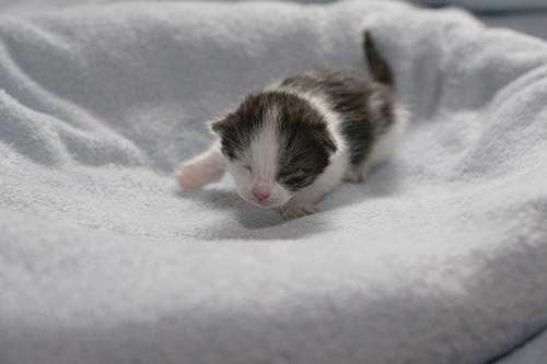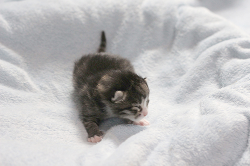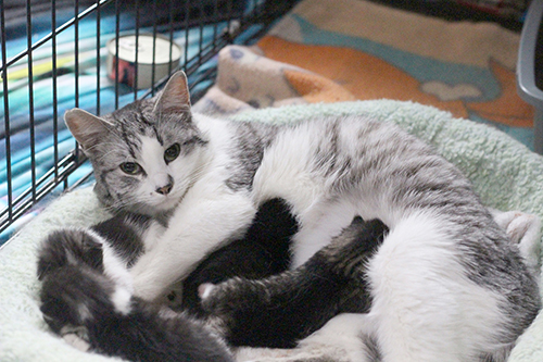 We don’t know much about Tilly, not even her age – she has yet to go for her first veterinary examination – but we do know that she enjoys receiving attention from humans, and is an excellent mother. Her foster-guardian remarked that she had not before hosted such quiet kittens. The reason? Tilly doesn’t let them cry for food; she is ready to care for their needs before they need them! She allowed her babies to be picked up, but didn’t want to be carried away from them herself.